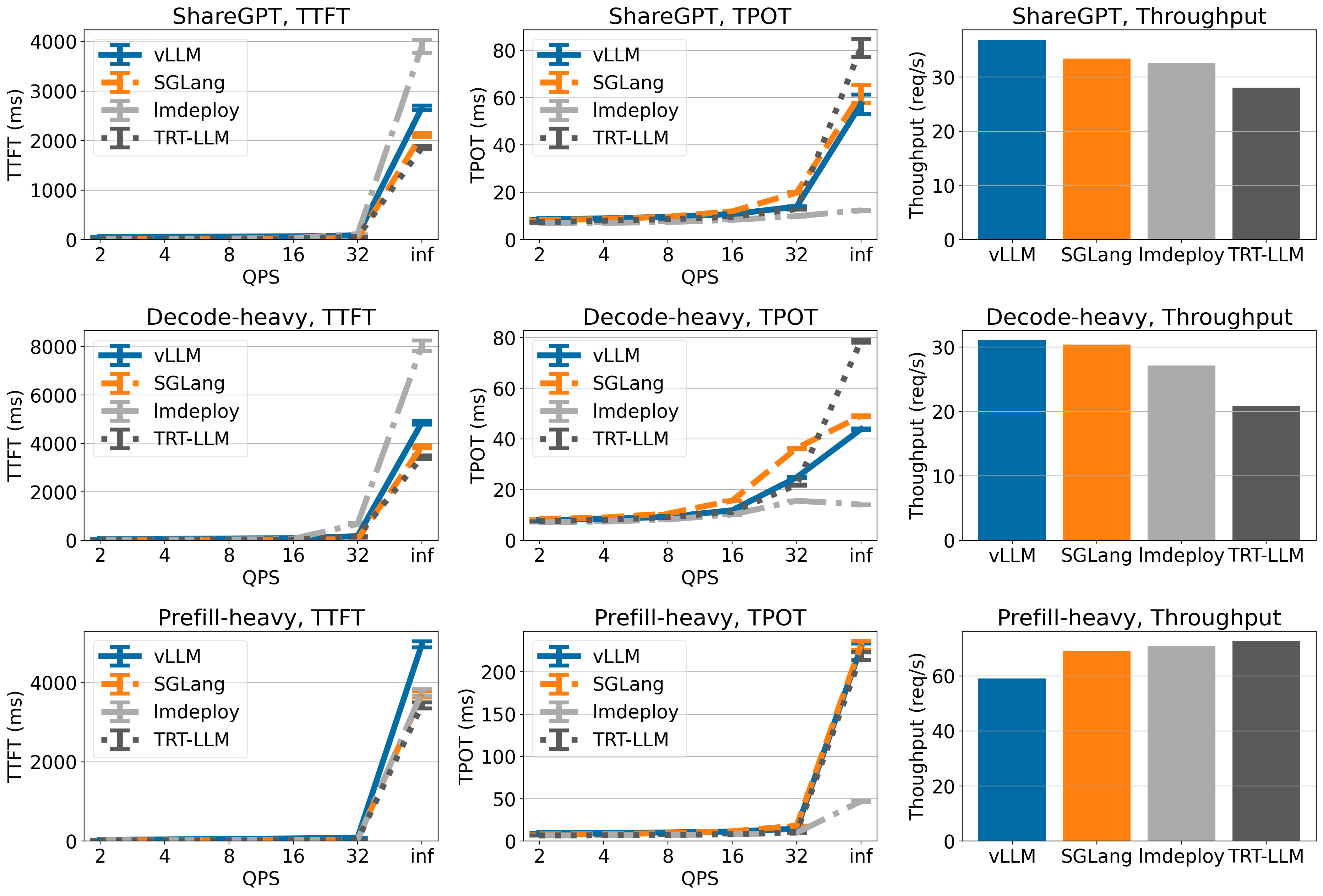 For the rest of performance benchmarks, as well as captured detailed metrics for time-to-first-token (TTFT) and time-per-output-token (TPOT), please refer to the appendix for more data and analysis. You can follow this github issue to reproduce our benchmark.