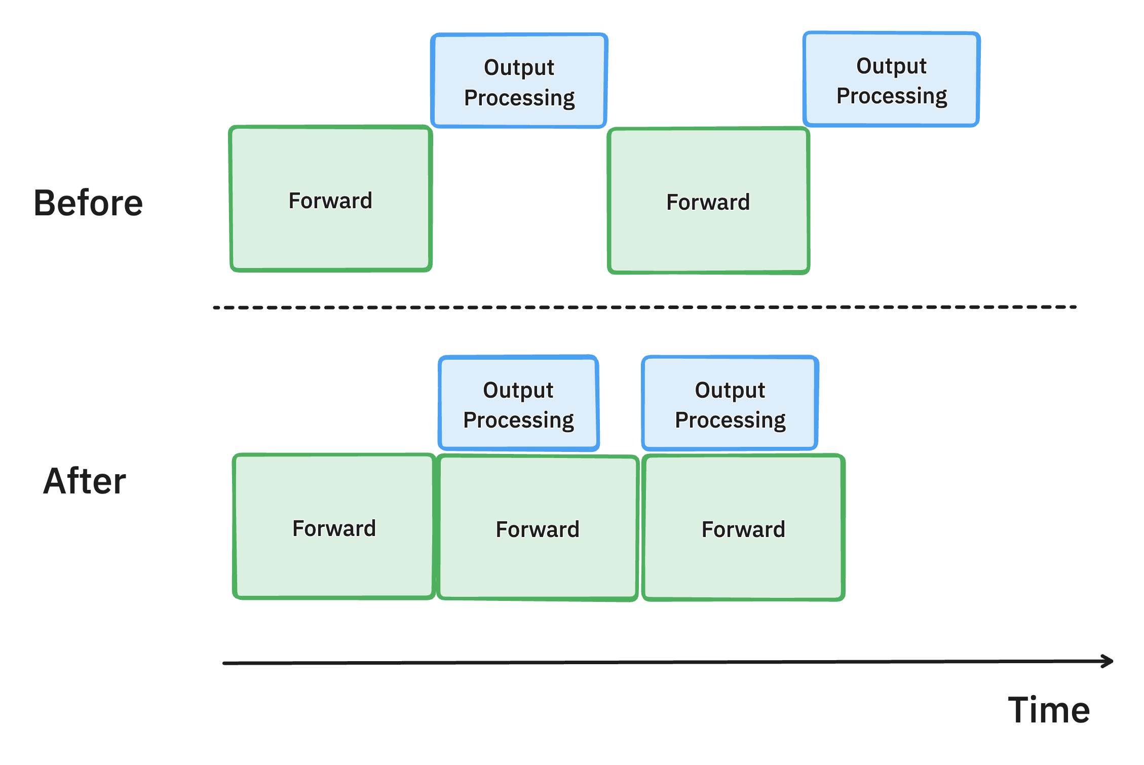Illustration of the asynchronous output processing in vLLM. By overlapping the CPU work for output data structure processing with the GPU computation, we reduced GPU idle time and improved throughput.